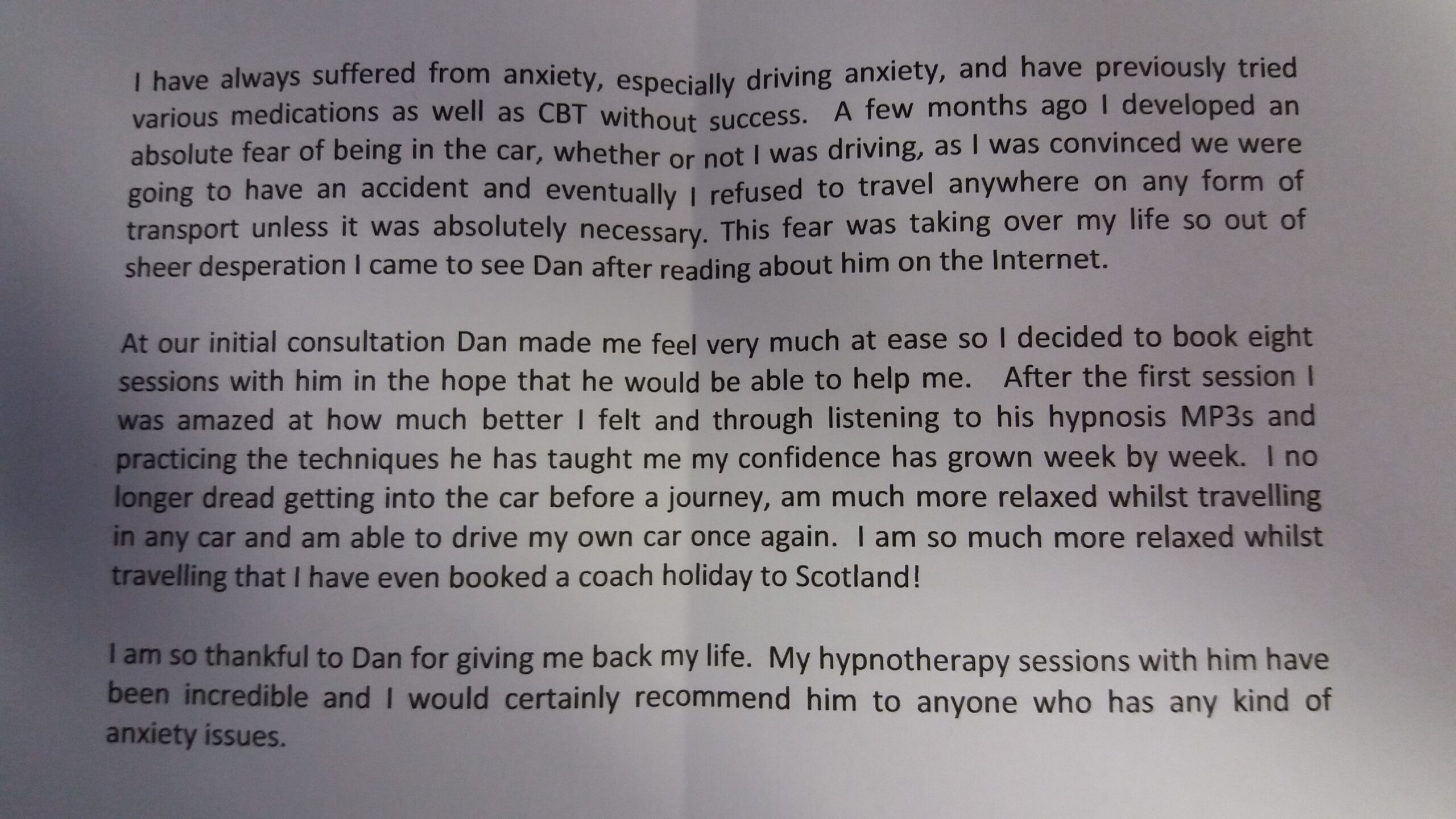 “I have always suffered with anxiety, especially driving anxiety, and have previously tried various medications as well as CBT without success. A few months ago I developed an absolute fear of being in the car, whether or not I was driving, as I was convinced we were going to have an accident and eventually I refused to travel anywhere on any form of transport unless it was absolutely necessary. This fear was taking over my life so out of sheer desperation I came to see Dan after reading about him on the internet.