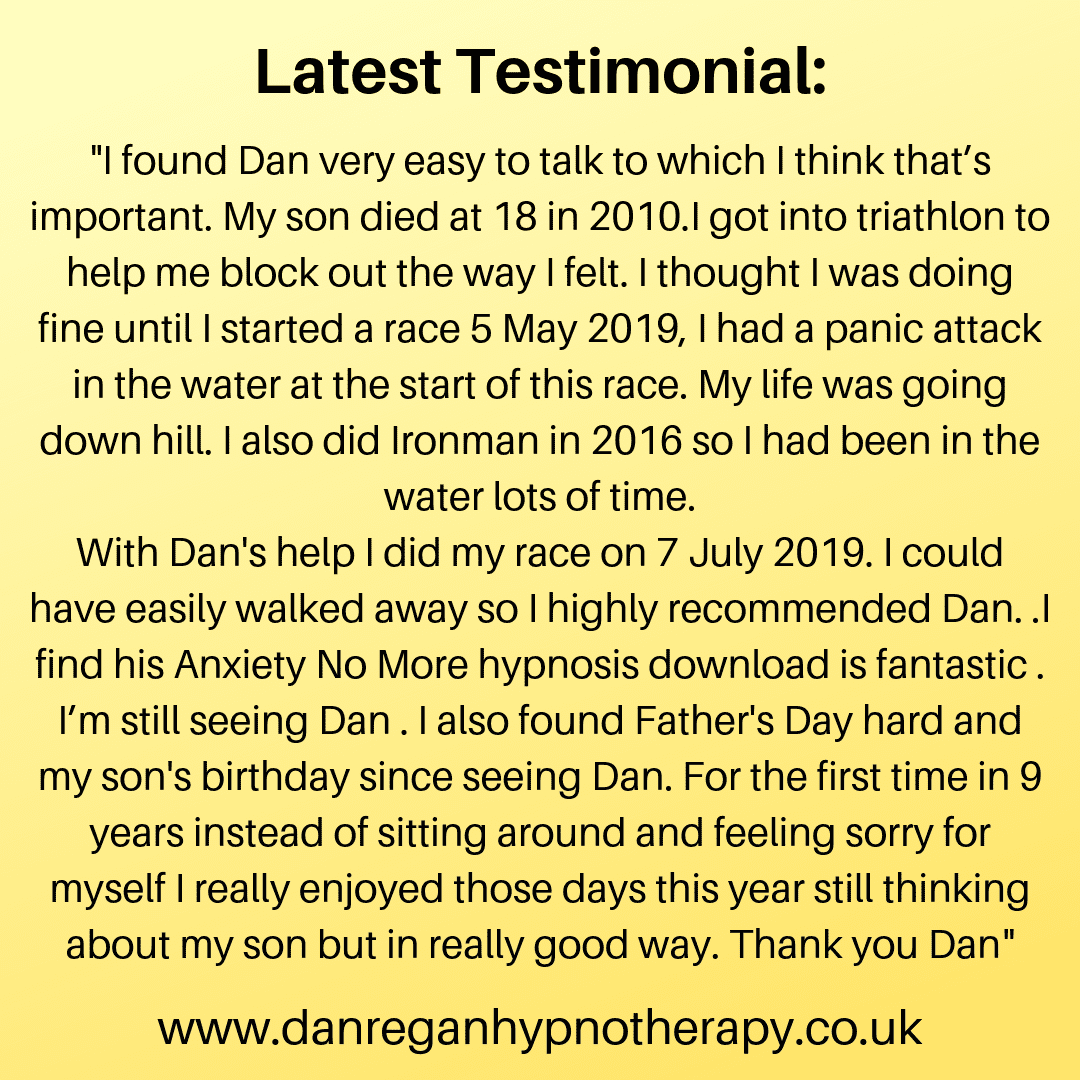 With Dan’s help I did my race on 7 July 2019. I could have easily walked away so I highly recommended Dan. I find his Anxiety No More hypnosis download is fantastic . I’m still seeing Dan . I also found Father’s Day hard and my son’s birthday since seeing Dan. For the first time in 9 years instead of sitting around and feeling sorry for myself I really enjoyed those days this year still thinking about my son but in really good way. Thank you Dan” (July, 2019).