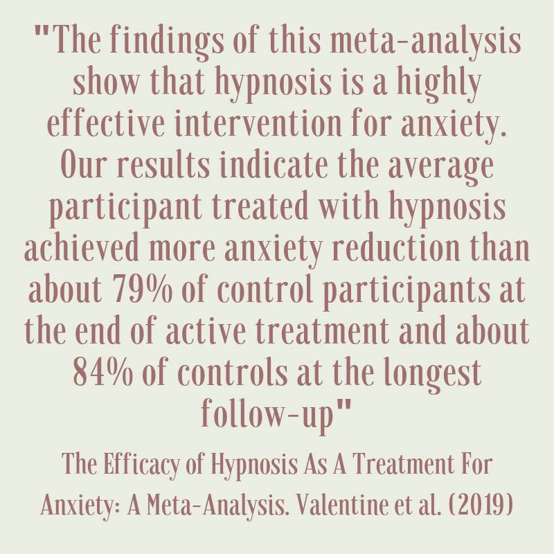 Reference: Valentine, K.E., Milling, L.S., Clark, L.J. and Moriarty, C.L., 2019. The Efficacy of Hypnosis as a Treatment for Anxiety: A Meta-analysis. International Journal of Clinical and Experimental Hypnosis, 67(3), pp.336-363.