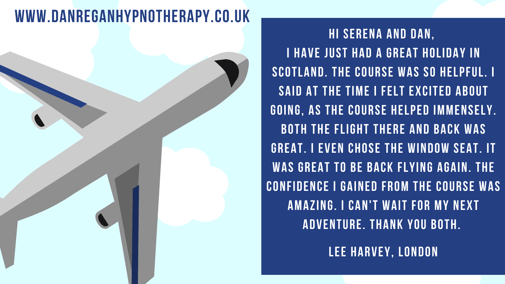 I have just had a great holiday in Scotland. The course was so helpful. I said at the time I felt excited about going, as the course helped immensely. Both the flight there and back was great. I even chose the window seat. It was great to be back flying again. The confidence I gained from the course was amazing. I can’t wait for my next adventure.