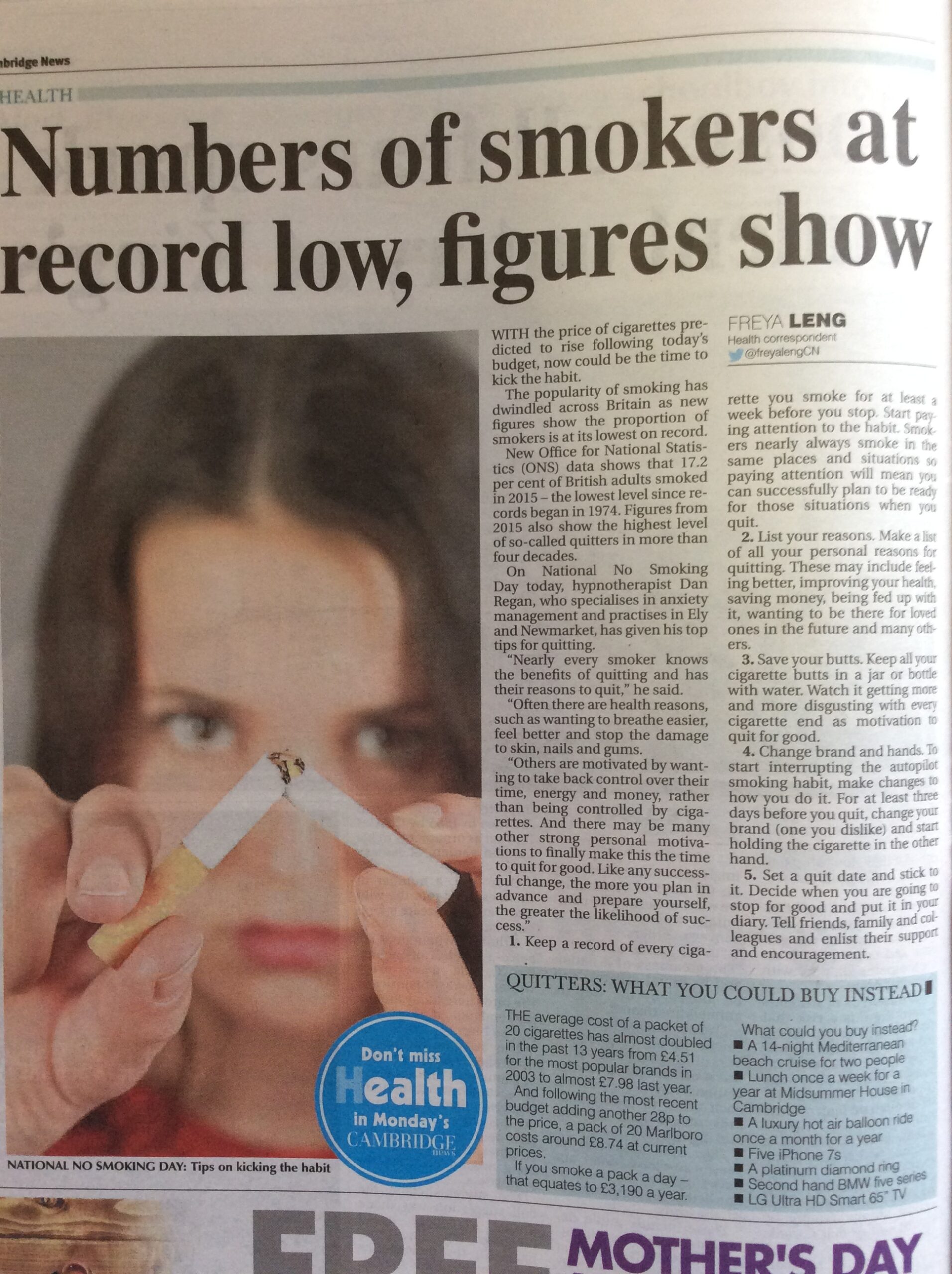 March 8th 2017 was National No Smoking Day and I was delighted to appear in the Cambridge News giving my top 10 tips to help you quit smoking.